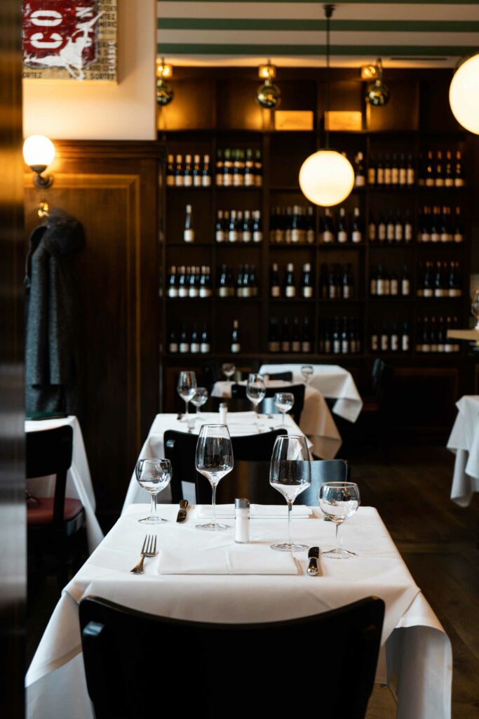 Unser Restaurant wird regulär mit weißen Tischtüchern und weißen Stoffservietten sowie mit Menü-Besteck, Weingläsern und Menagen eingedeckt.